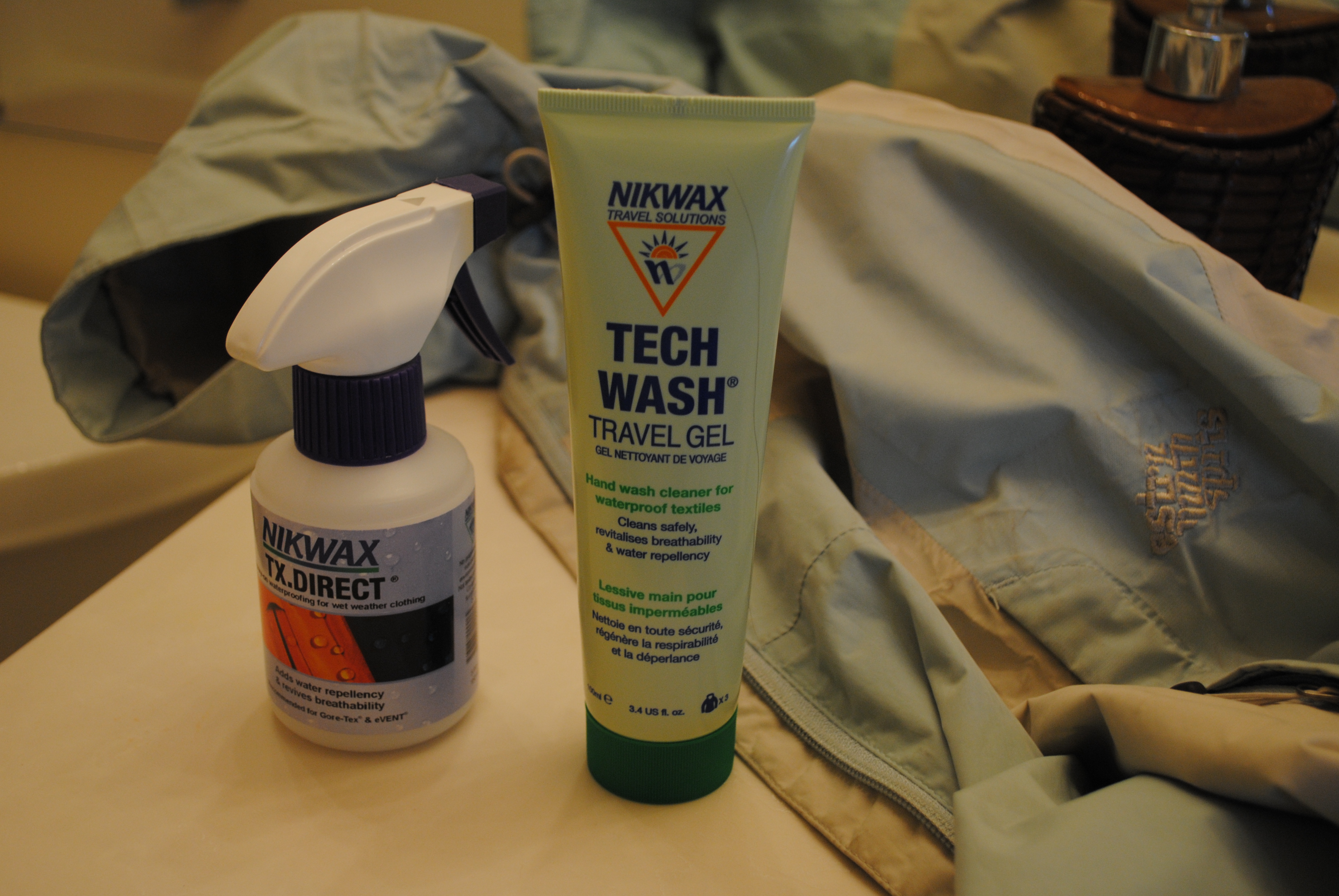 Once the shell dries most of the way and still a little damp, I lay the garment flat and systematically spray every section of the shell with Nikwax TX Direct. The shell needs some water moisture on it to properly receive the spray treatment. If it over dries prior to spraying, run it through the shower for a moment. Be sure to put an unused trash bag under the shell before spraying: the spray can leave tiled floors quite slippery. Follow the instructions on the bottle, which calls you to wipe off any excess spray and water from the garment after a few moments. Then repeat on the other side before allowing it to hang dry.